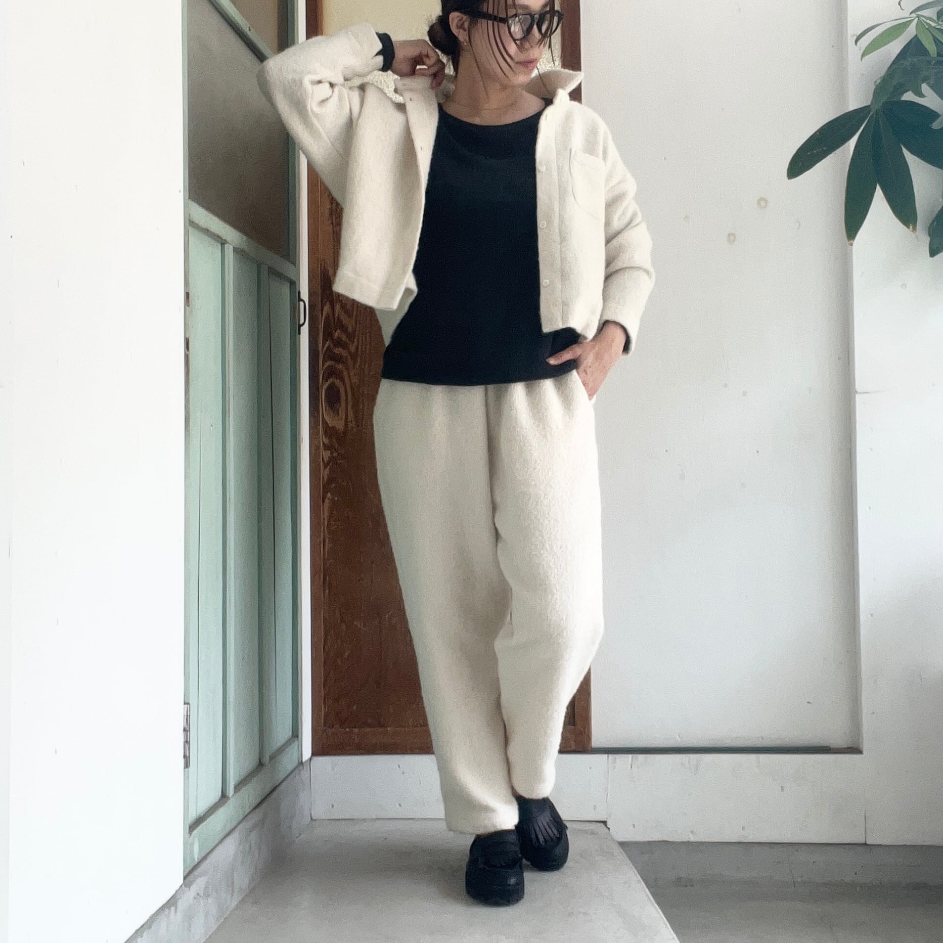 素材はツイード生地を毛羽立たせたふわふわの質感が上品な、コットンウール素材。