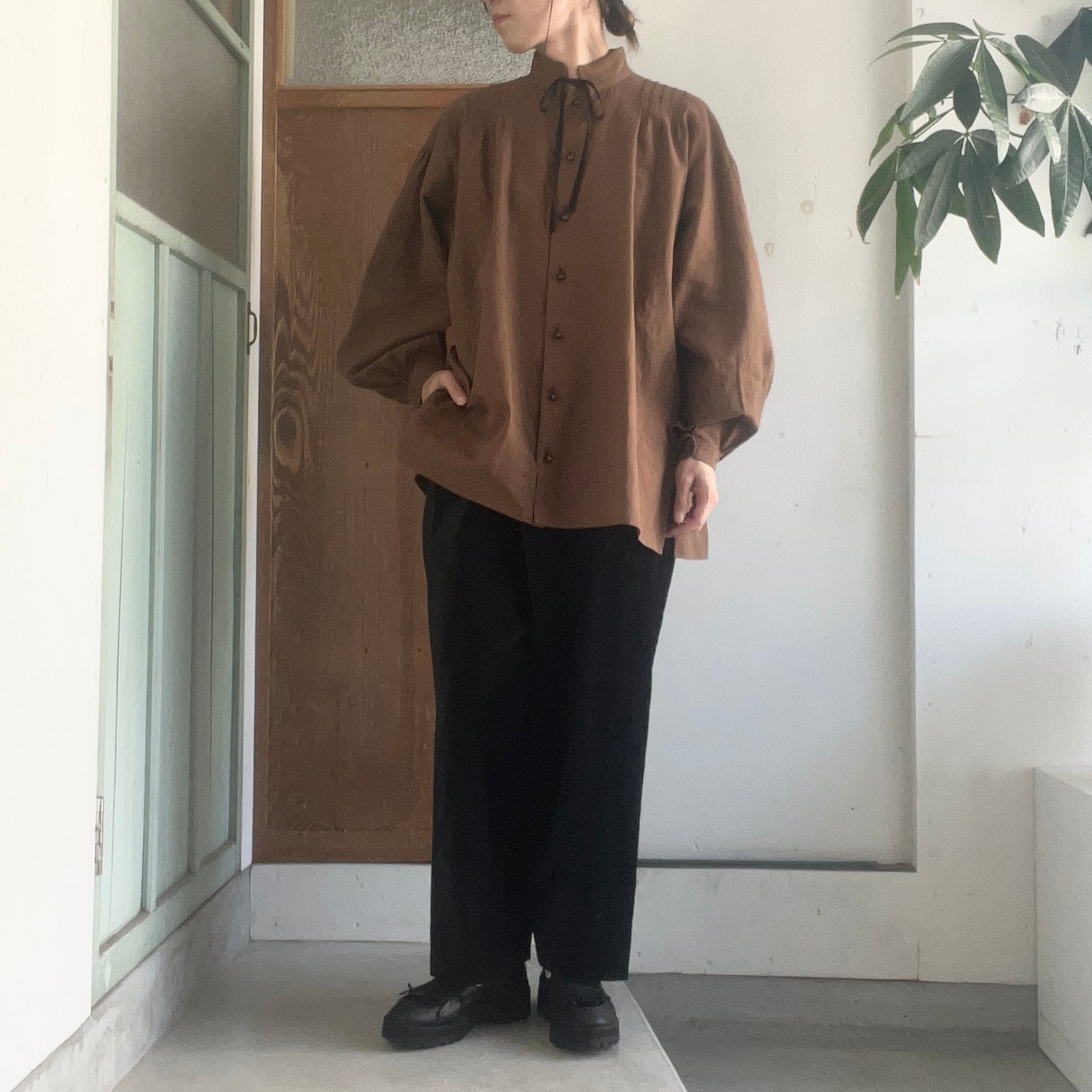 素材はリネンにコットンを混ぜて番⼿や密度、節の調整などを試⾏錯誤しながら、コシがあってほんの僅かに光沢を持った静かに主張するオリジナル⽣地。