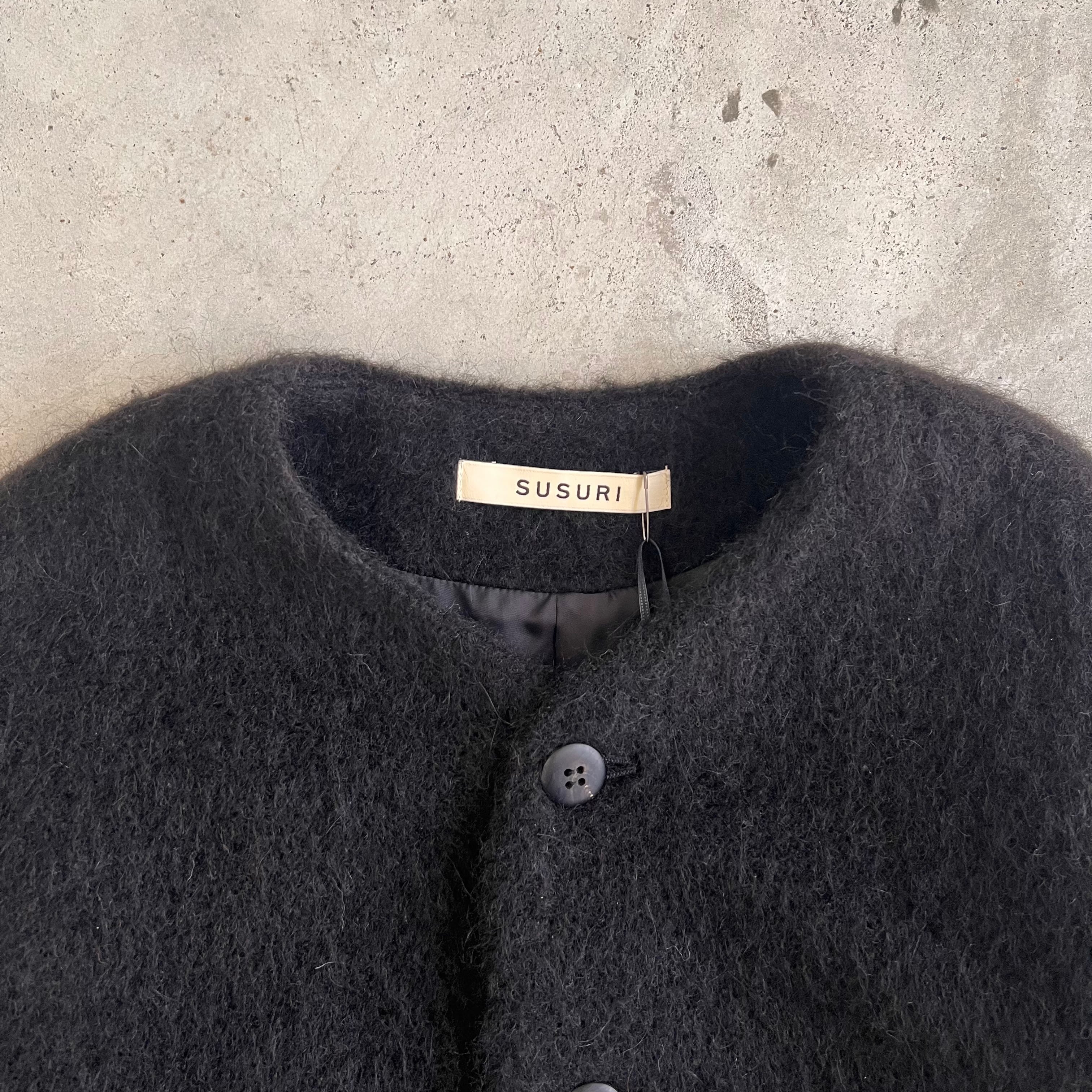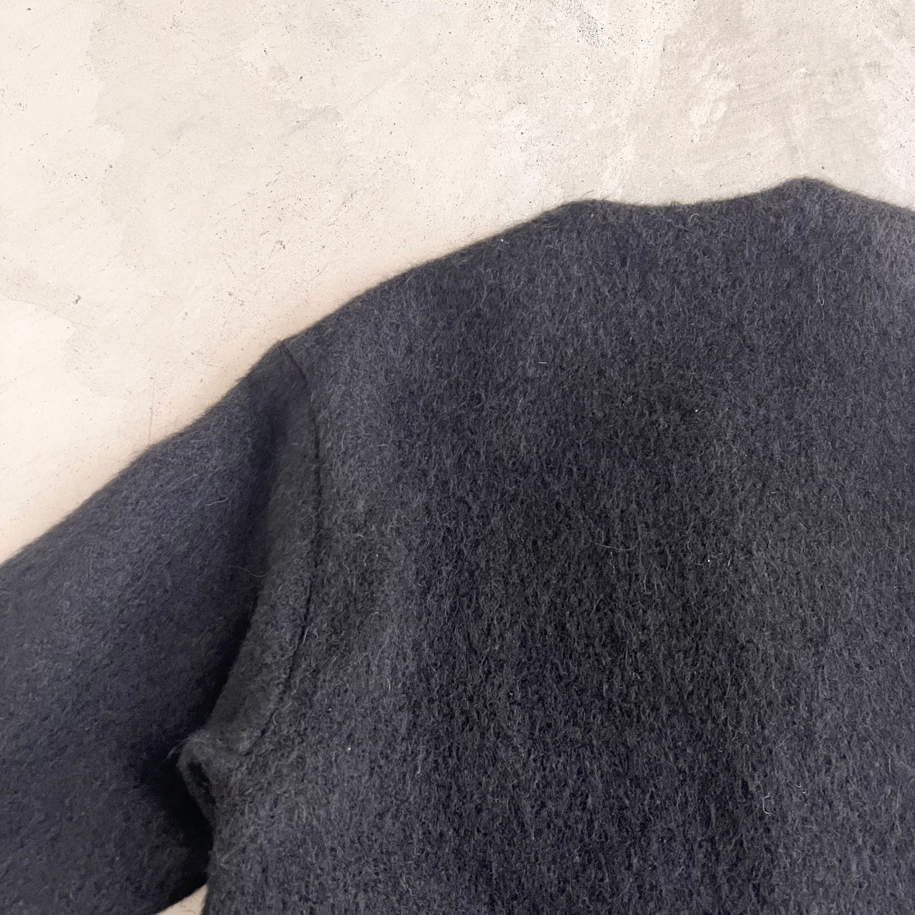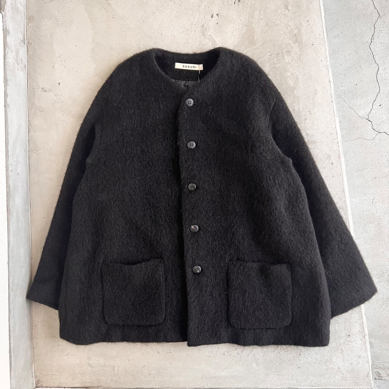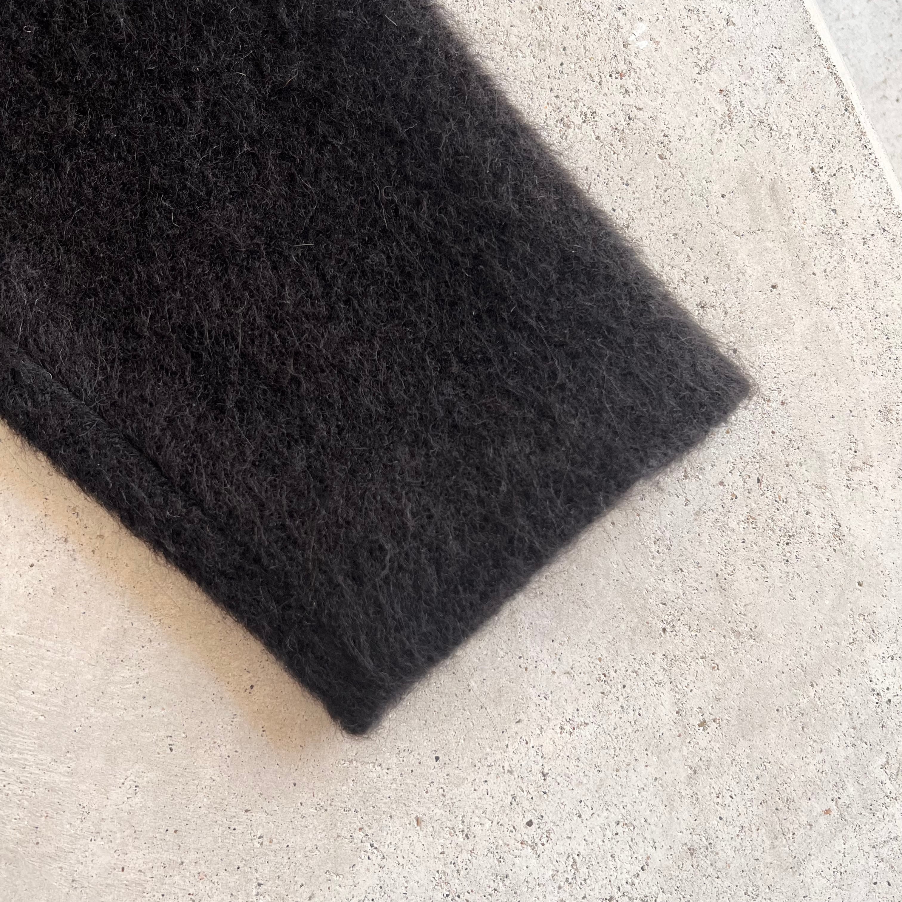 素材は、2 ⾊の異なるトップの⿊いアルパカ⽷を主体に、柔らかいウールと硬い英国⽺⽑を混ぜて織り上げ、起⽑をかけた後の⽑⾜を切り揃えないで動きが出るように仕上げたオリジナルの生地。