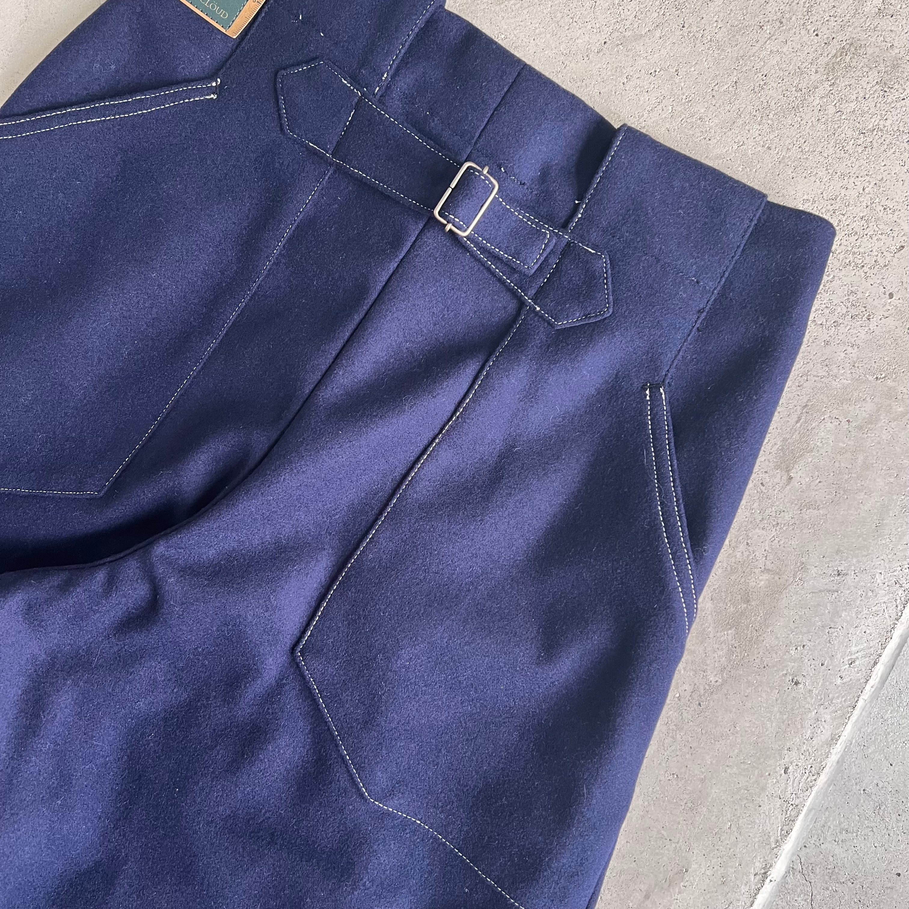 前から見るとスラックスのようなスッキリとした印象で、後ろはステッチワークのワークウェアのようなディテールが施されています。