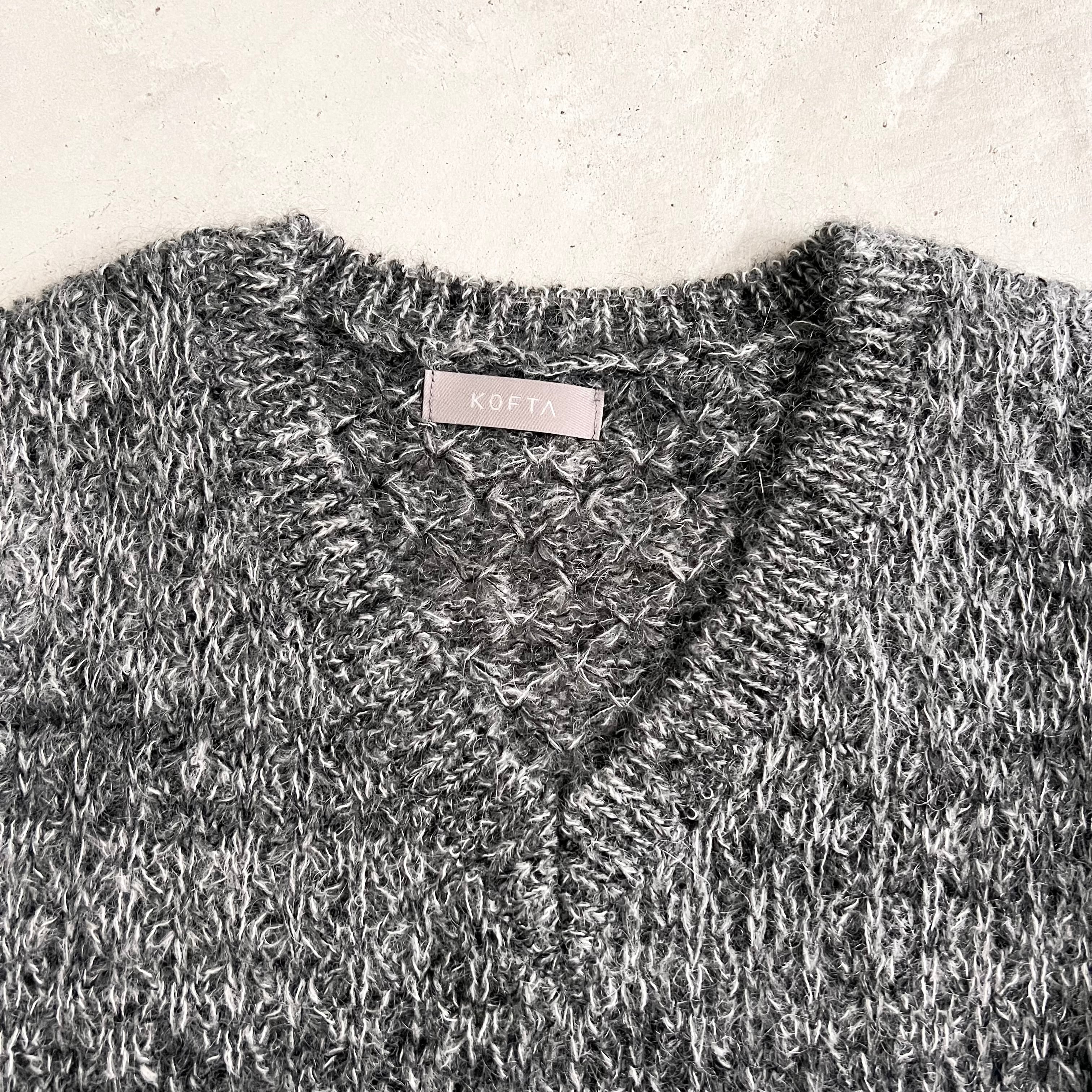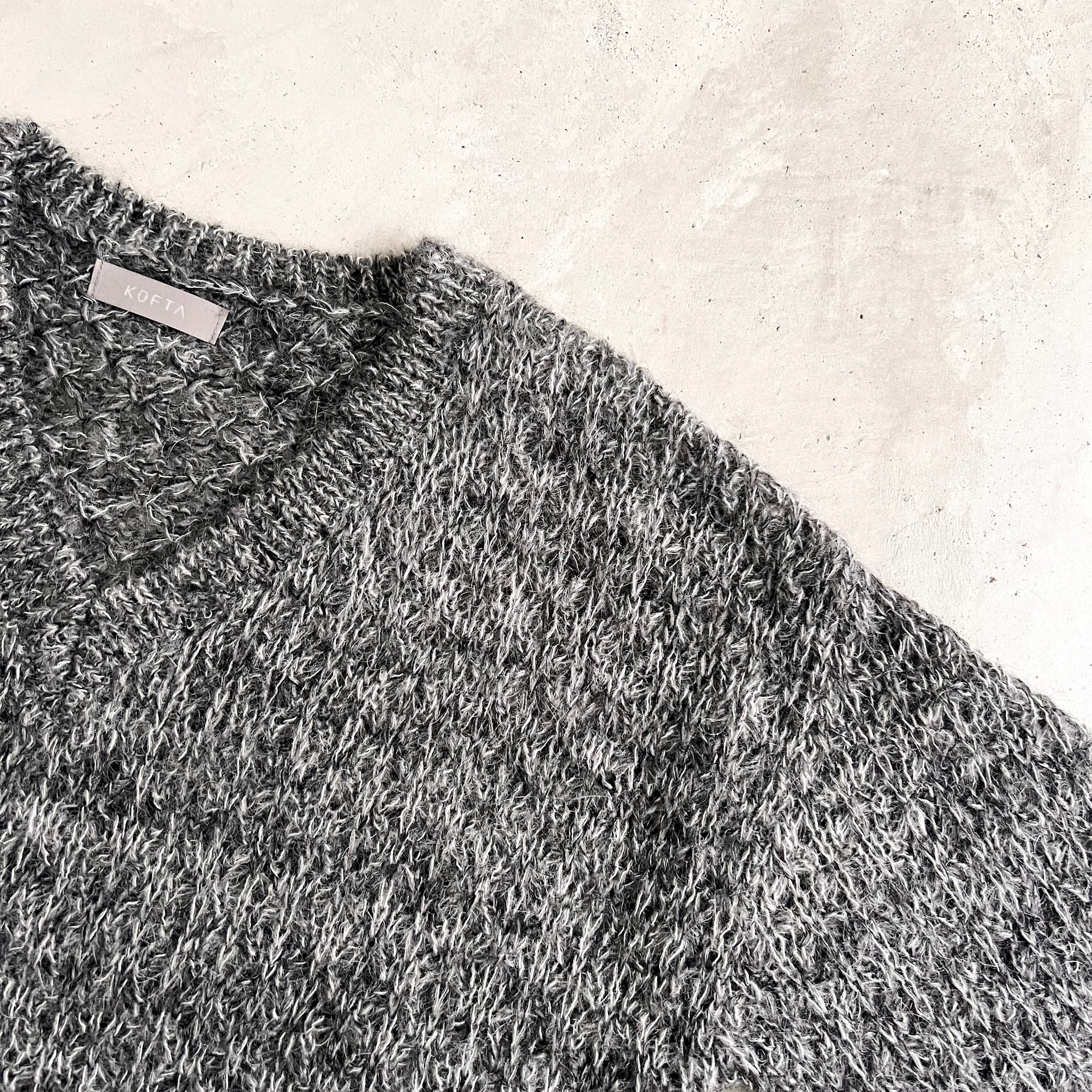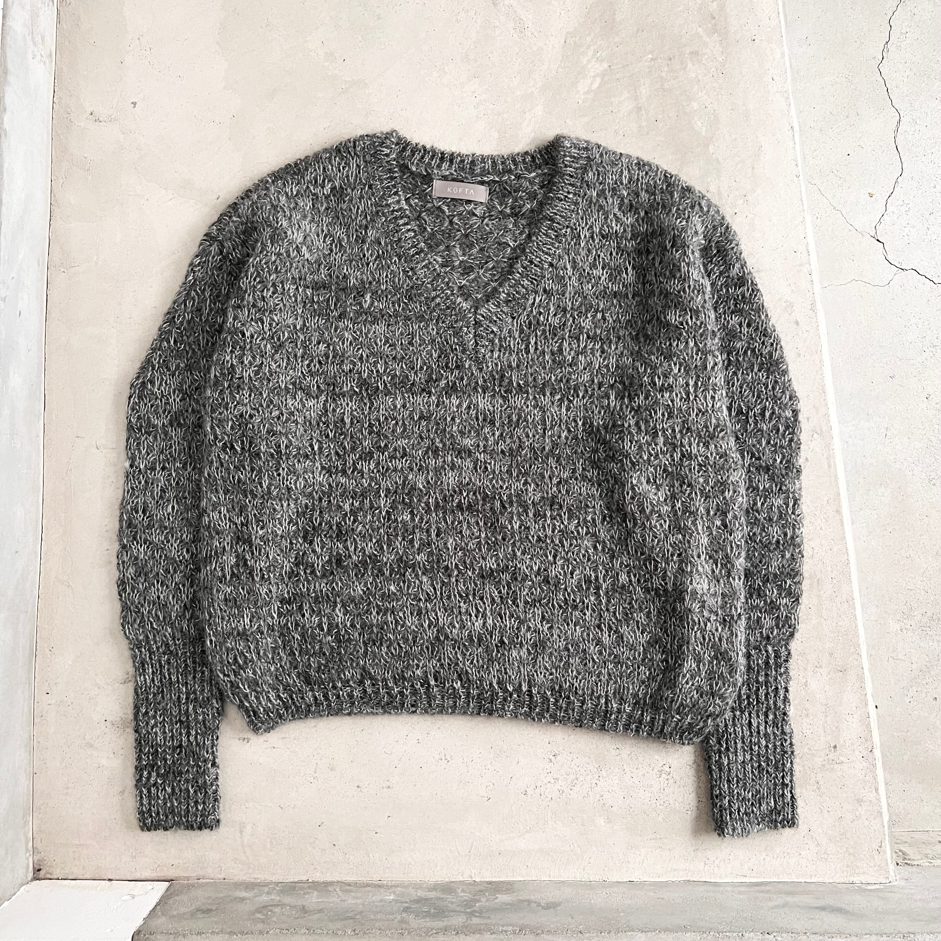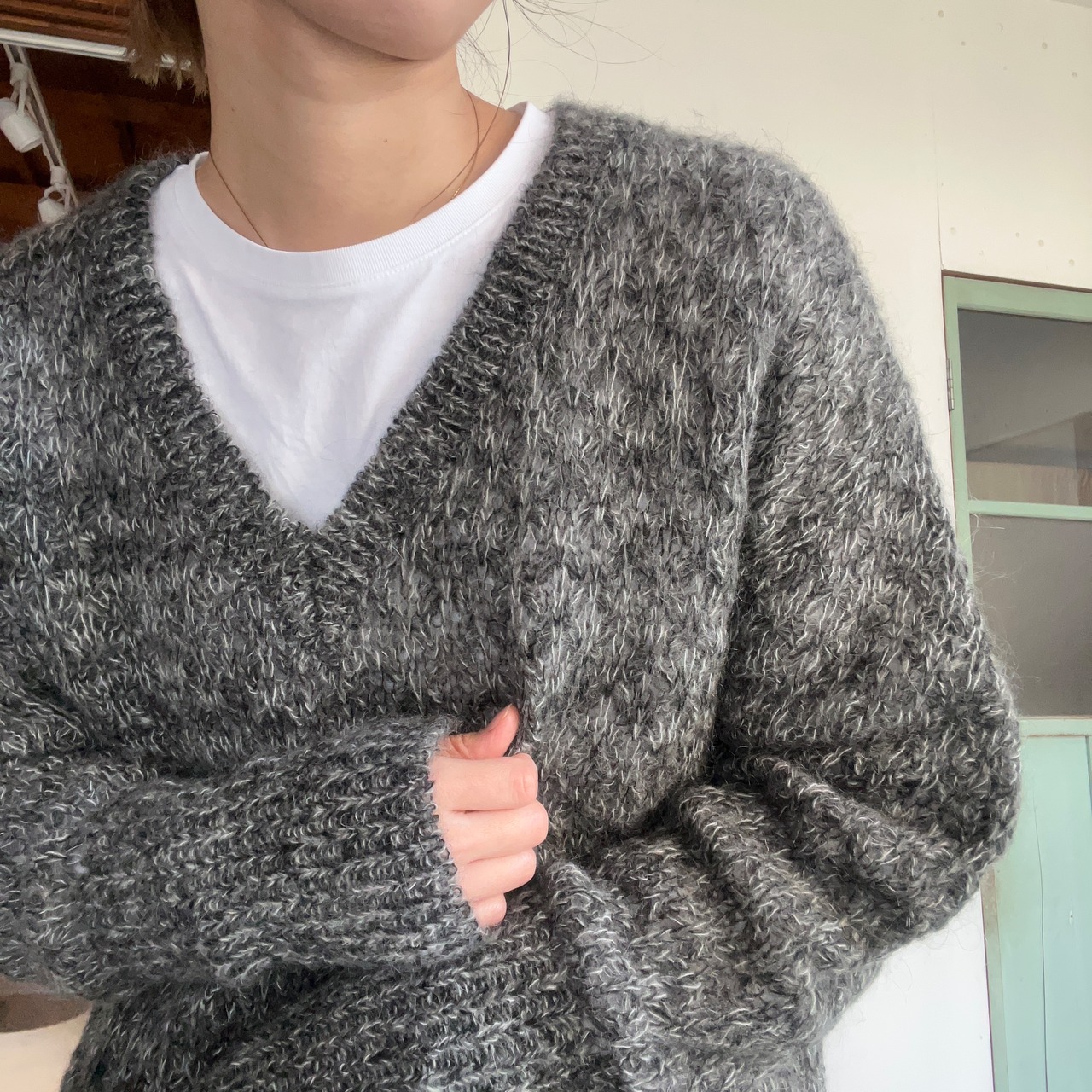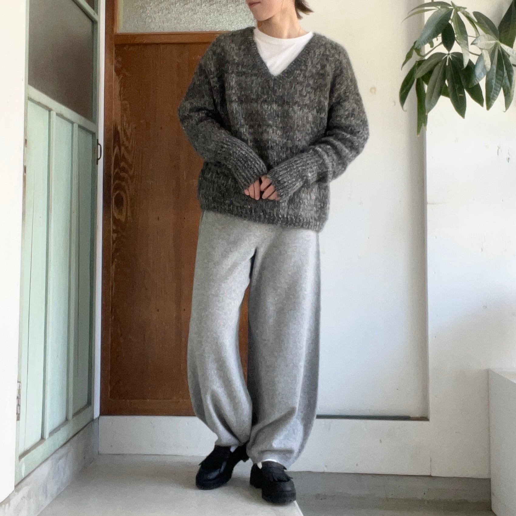 ふんわりとした女性らしい質感ですが、深めのVネックなので甘くなりすぎず、インナーの色やデザインで変化を楽しめます。