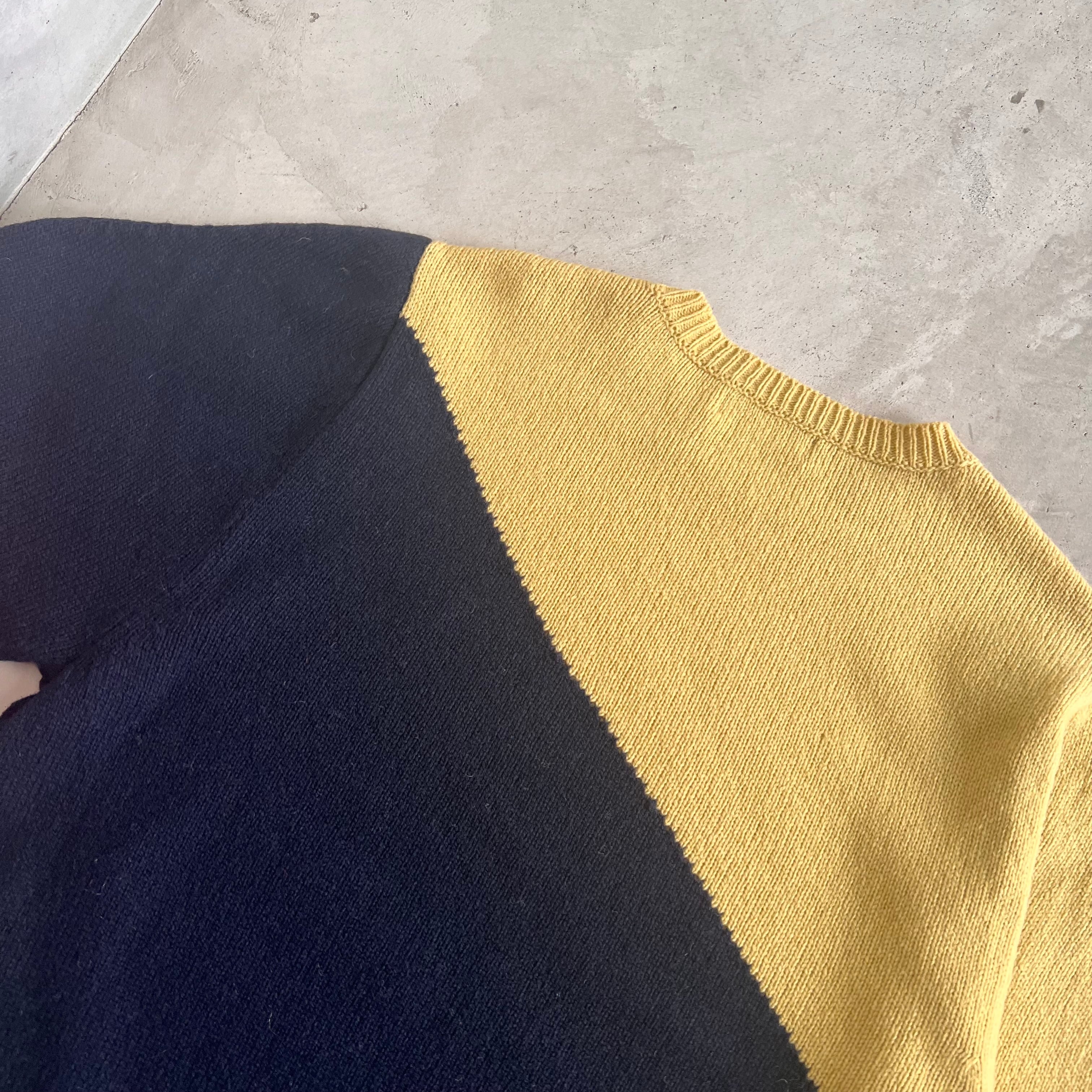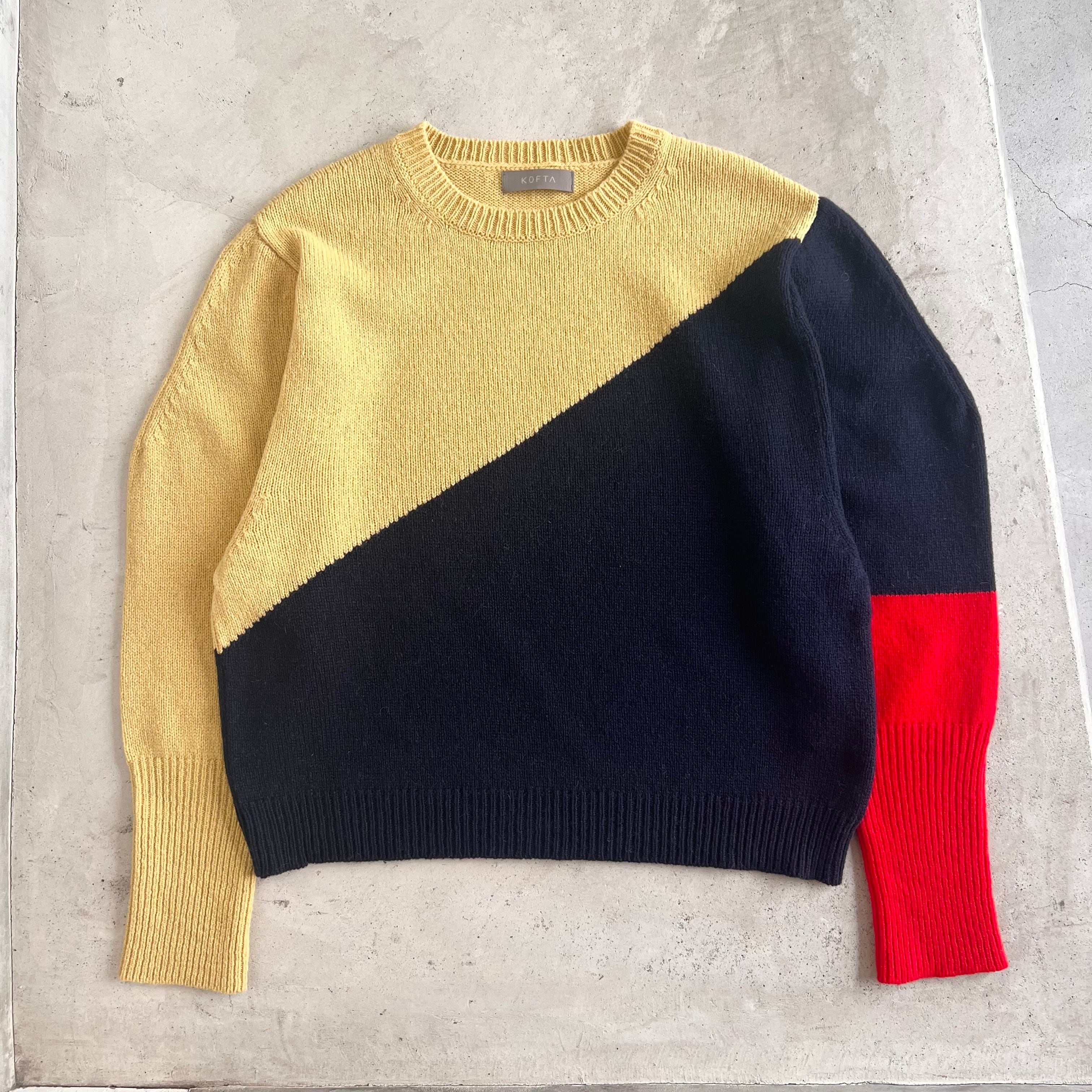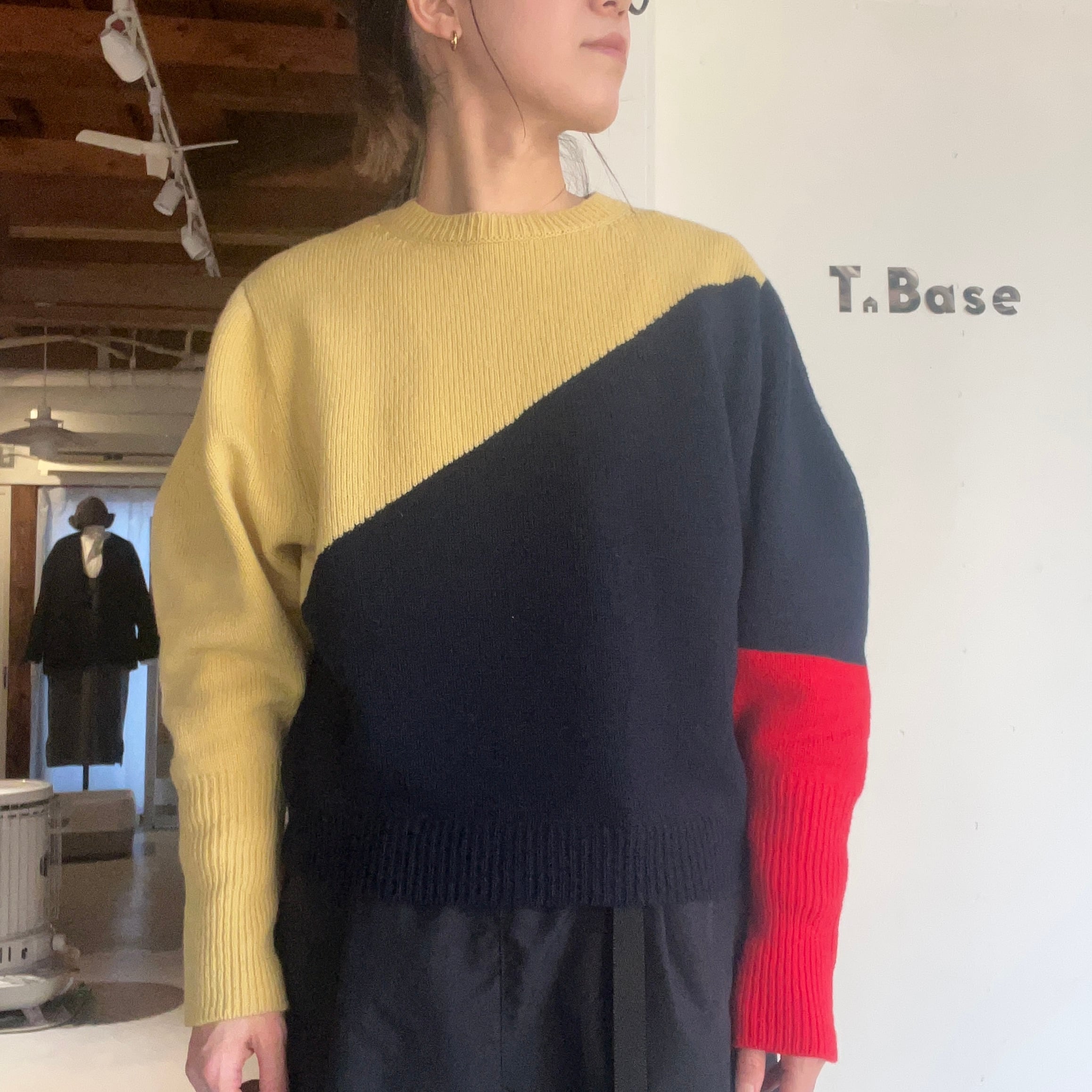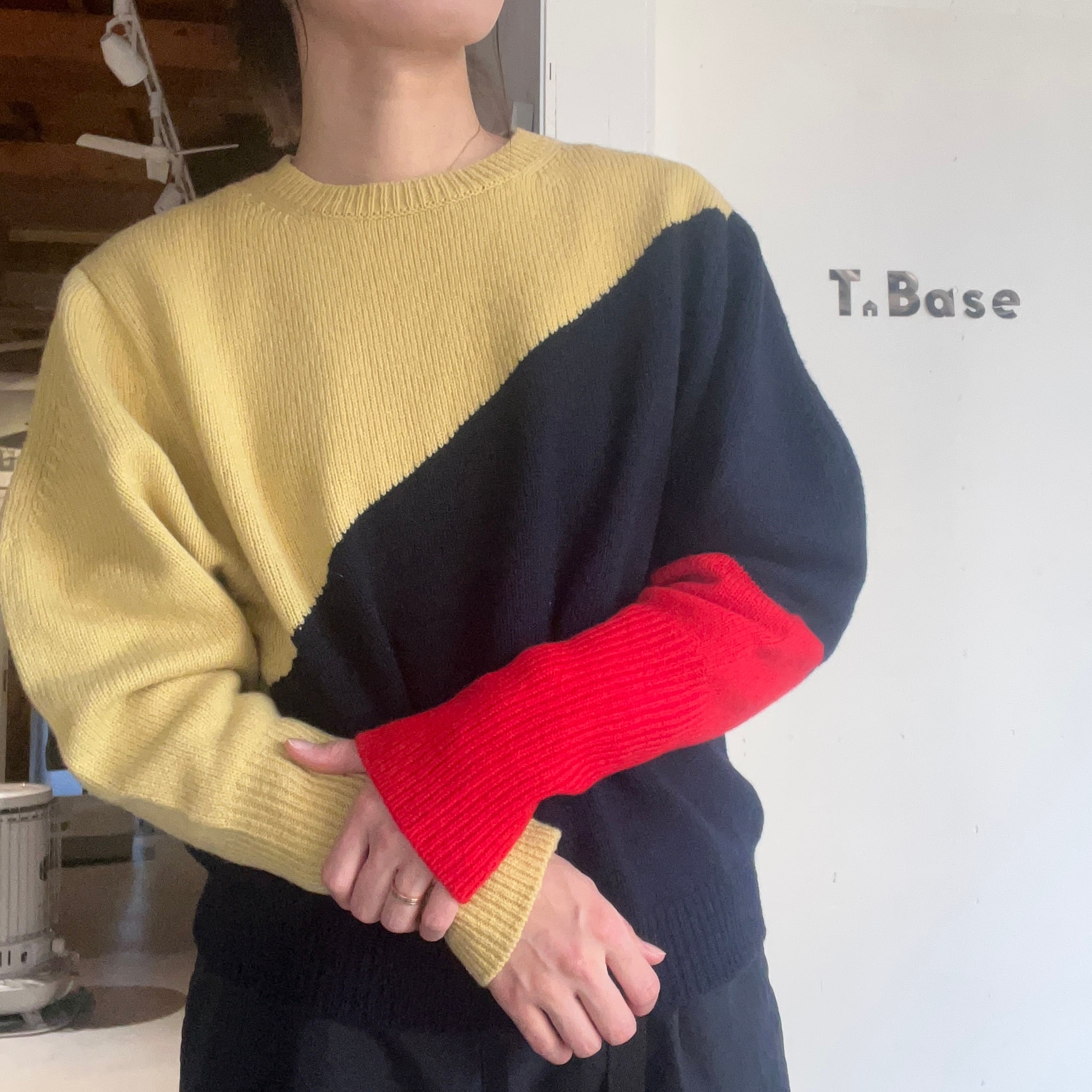 斜めにラインを入れたパネルカラーがおもしろいニットです。