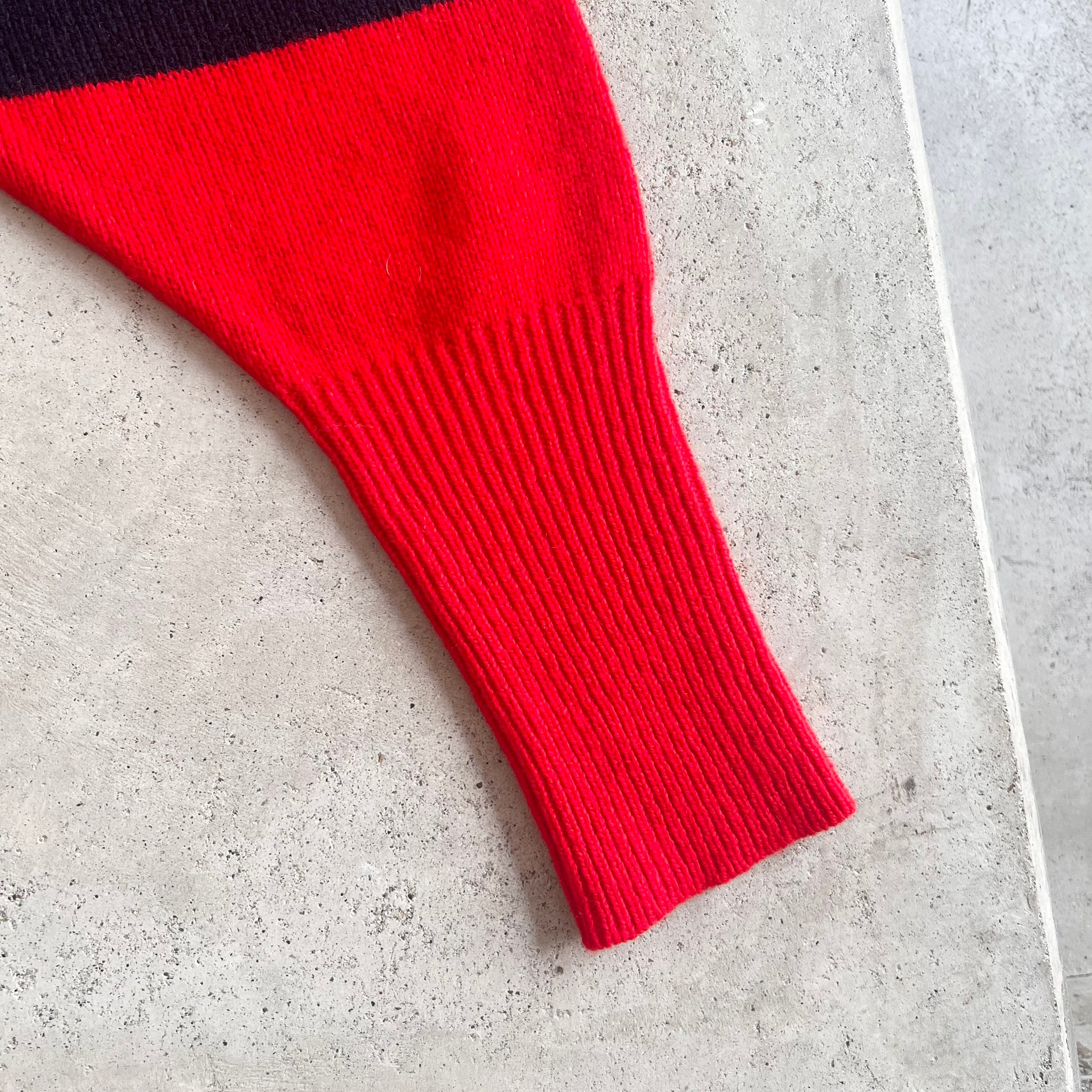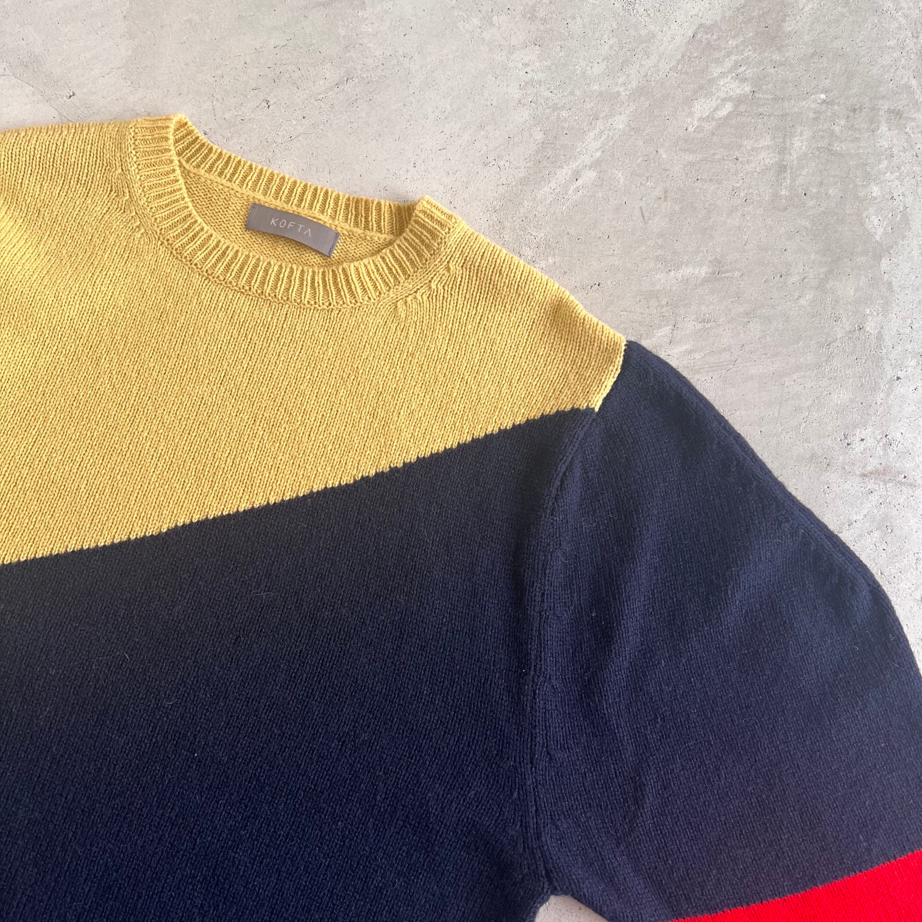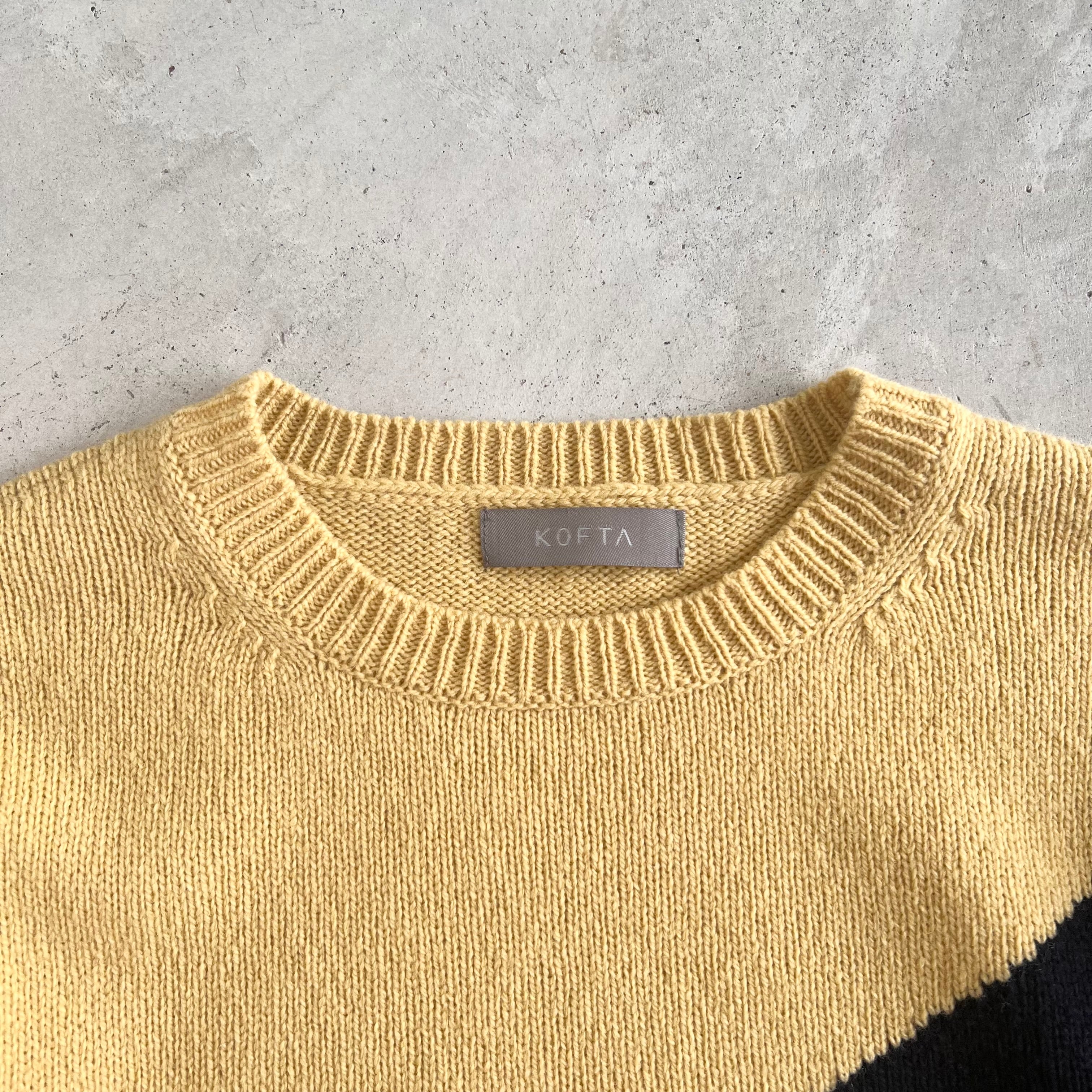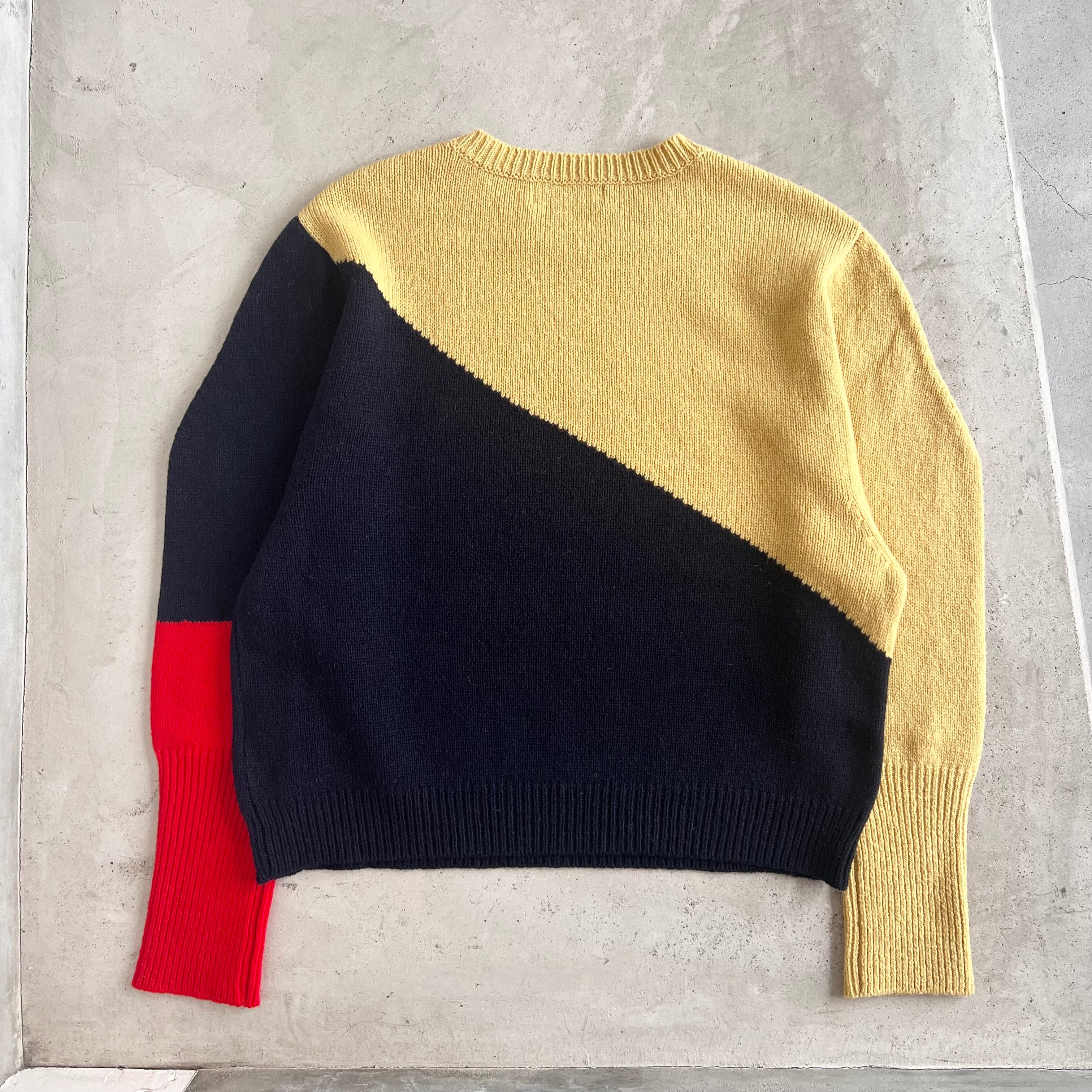 斜めにラインを入れたパネルカラーがおもしろいニットです。