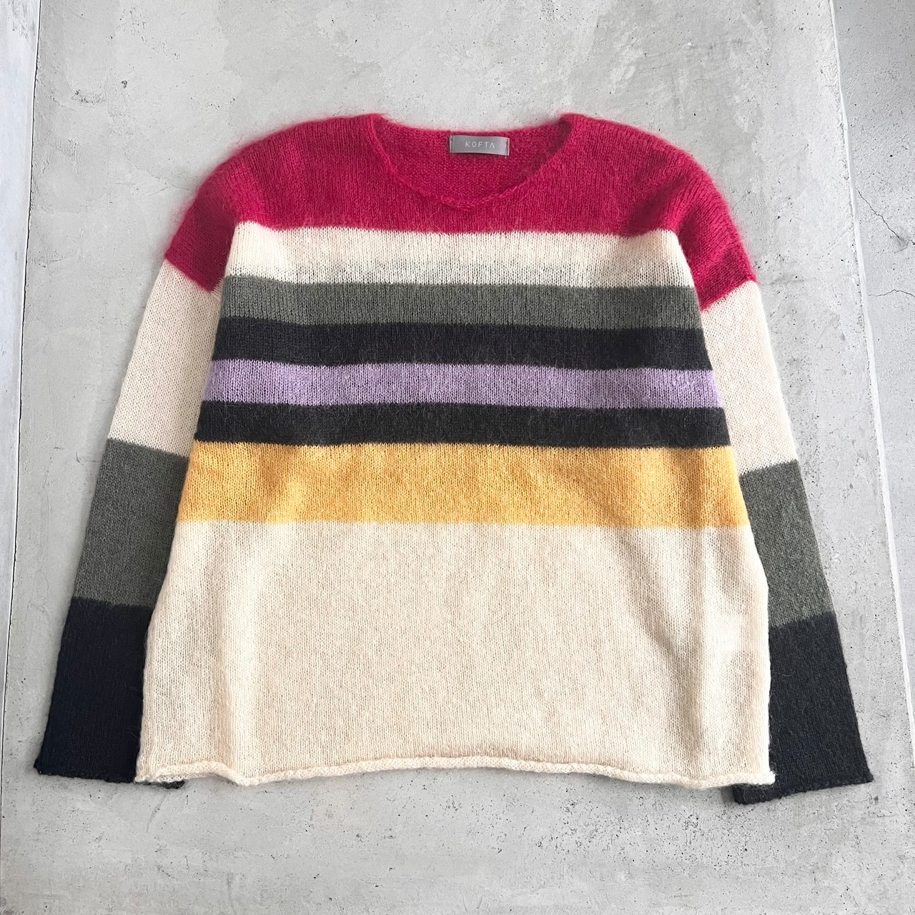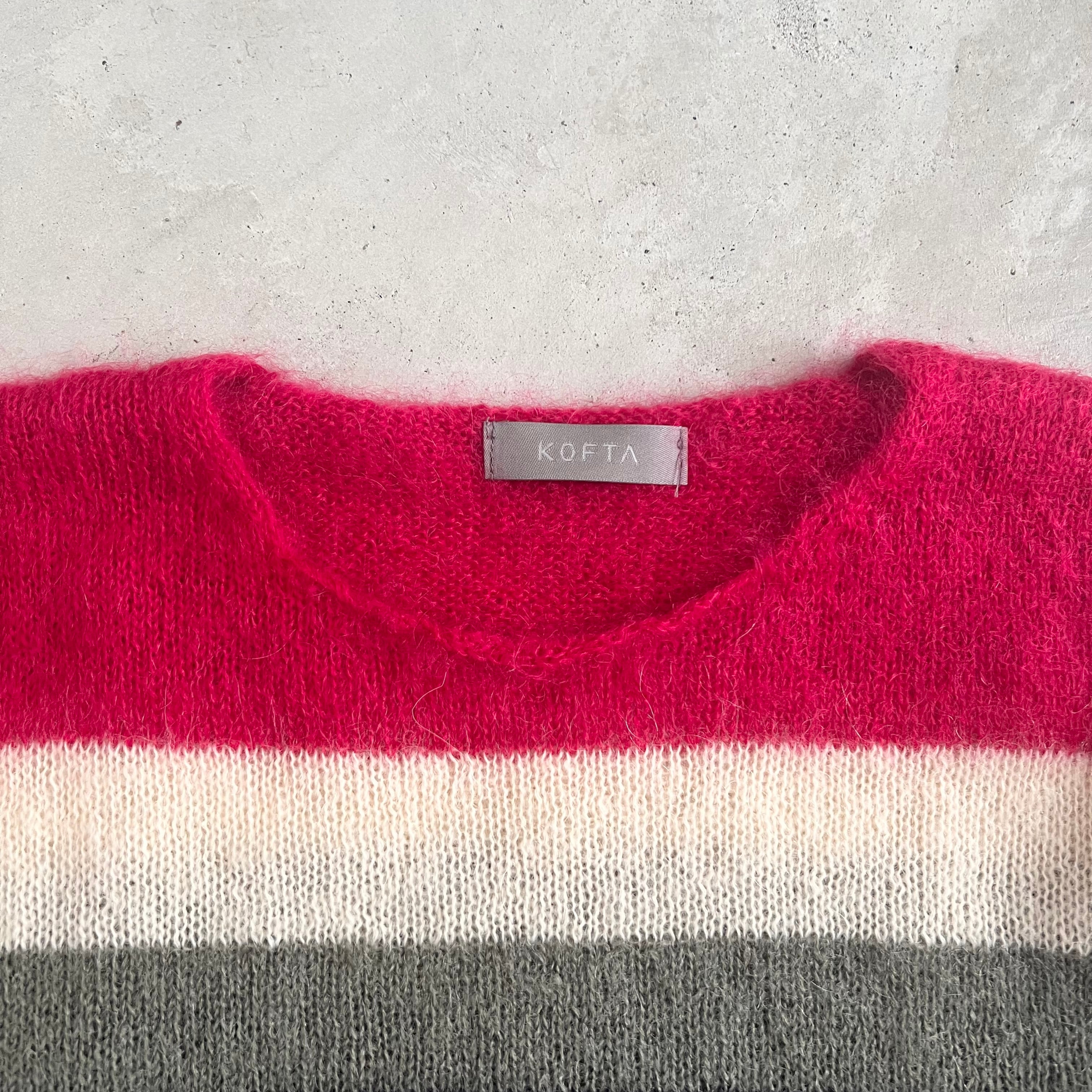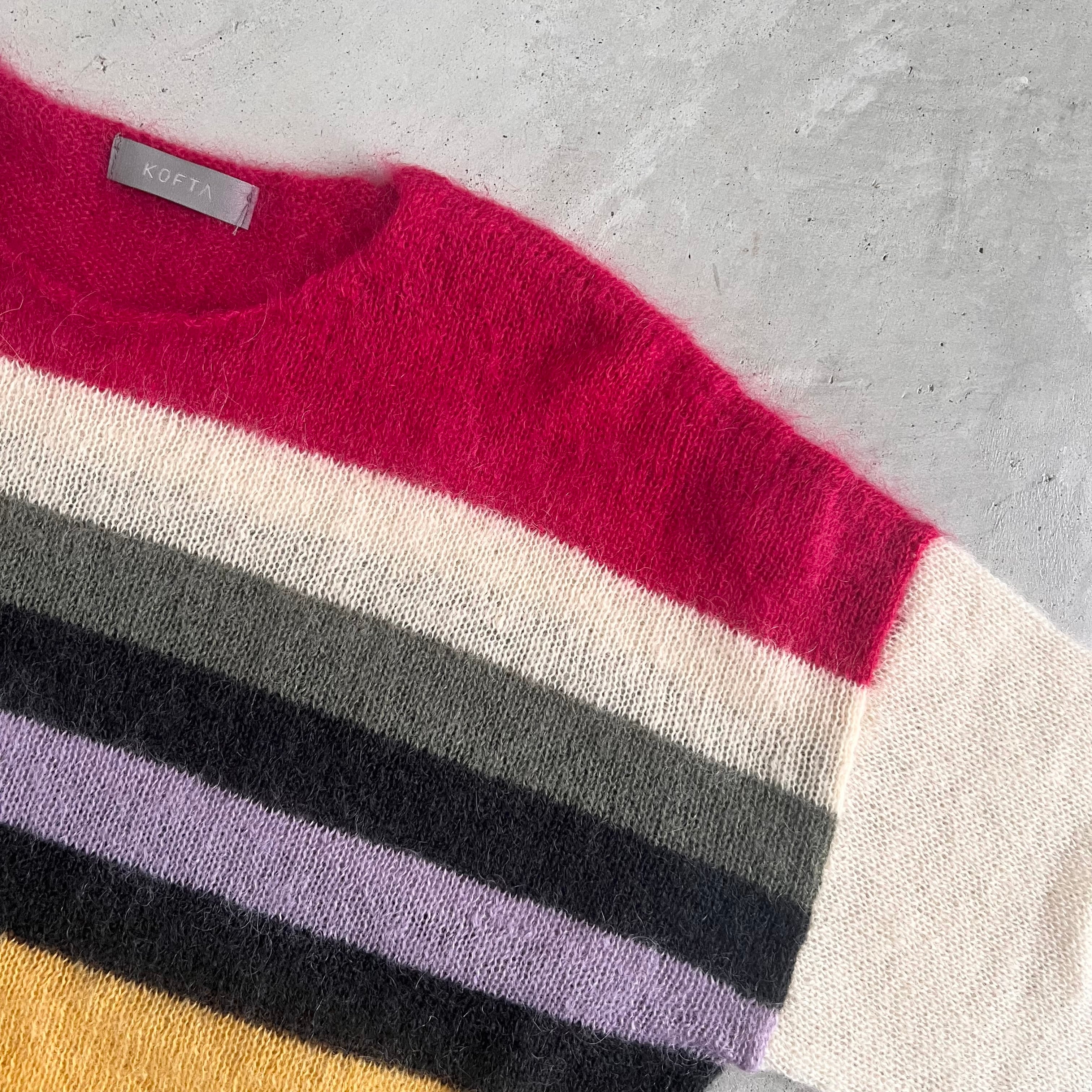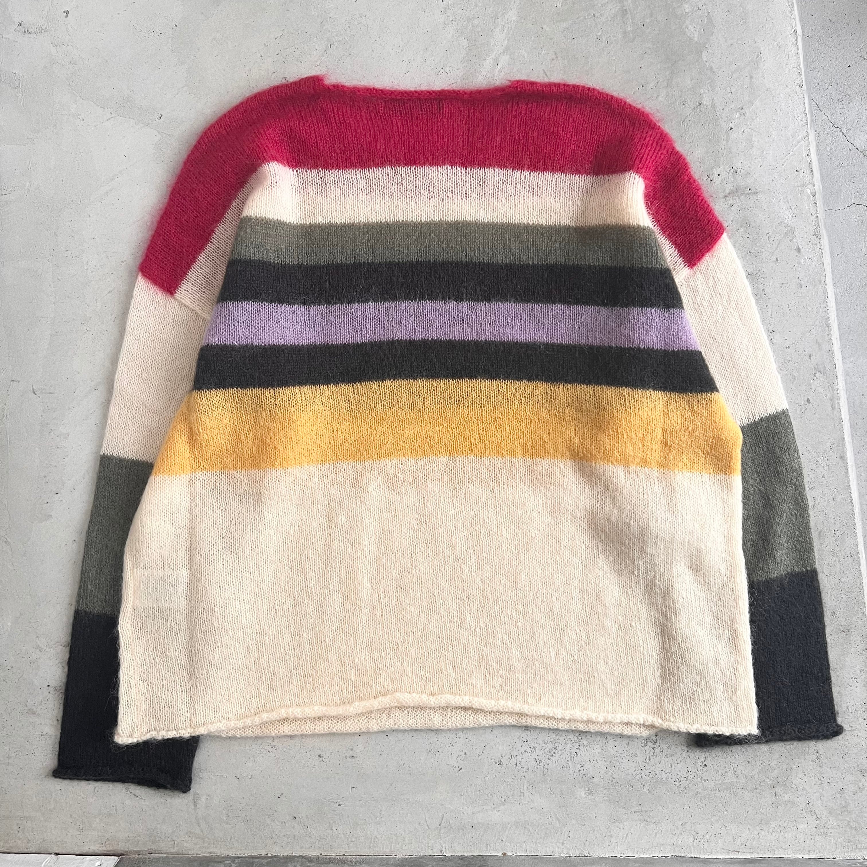 カラフルなグミをイメージした配色が印象的な、モヘア混のニットになります。