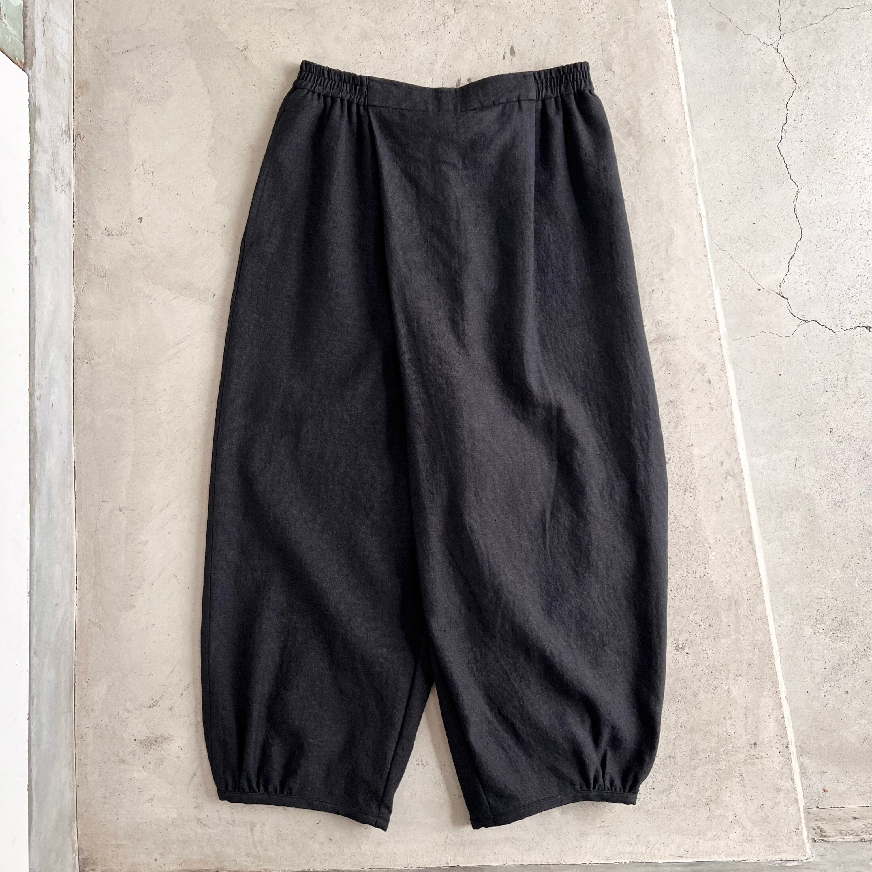 タイパンツのように折り重なったフロントのデザインと、バルーン型にすぼまった裾のフォルムが特徴です。