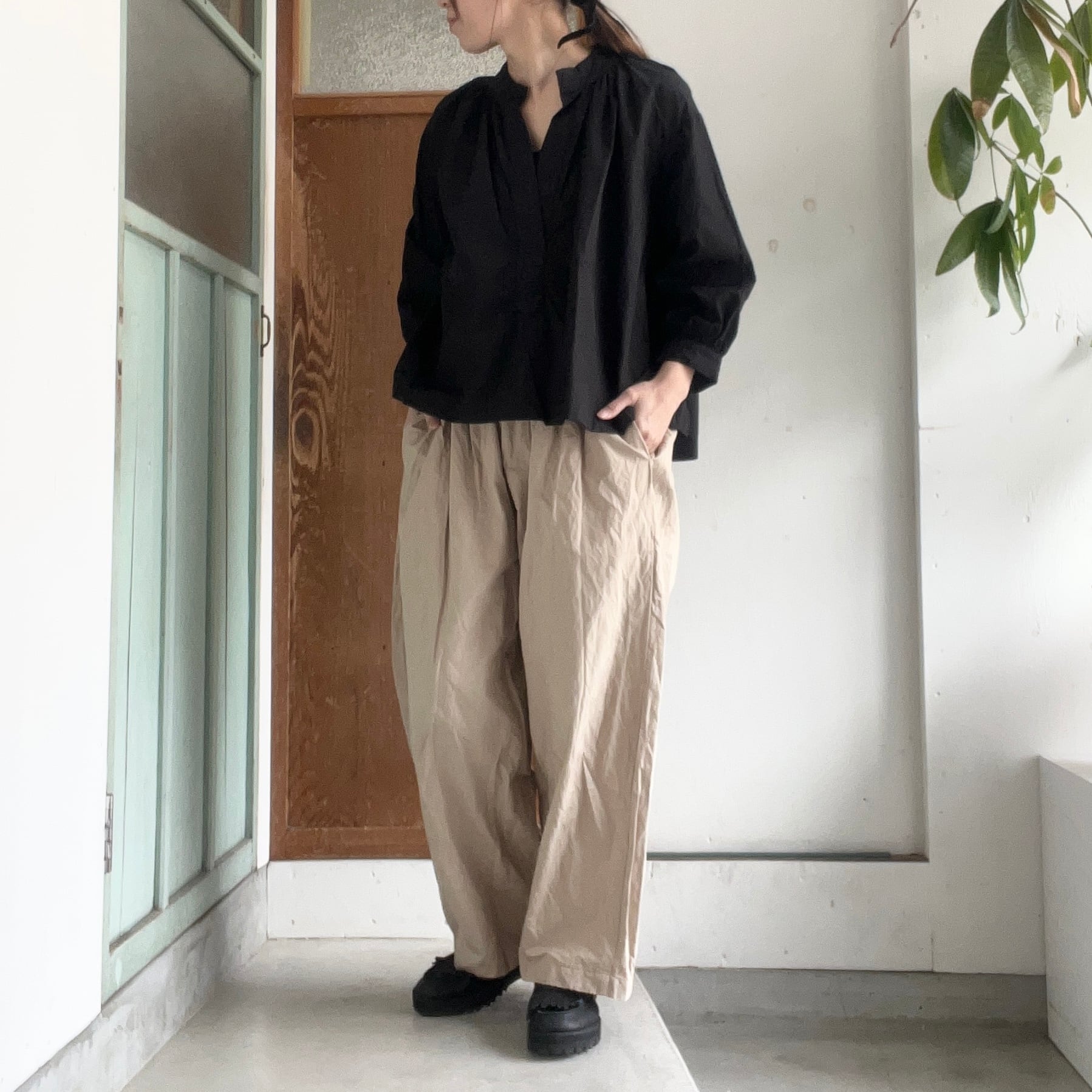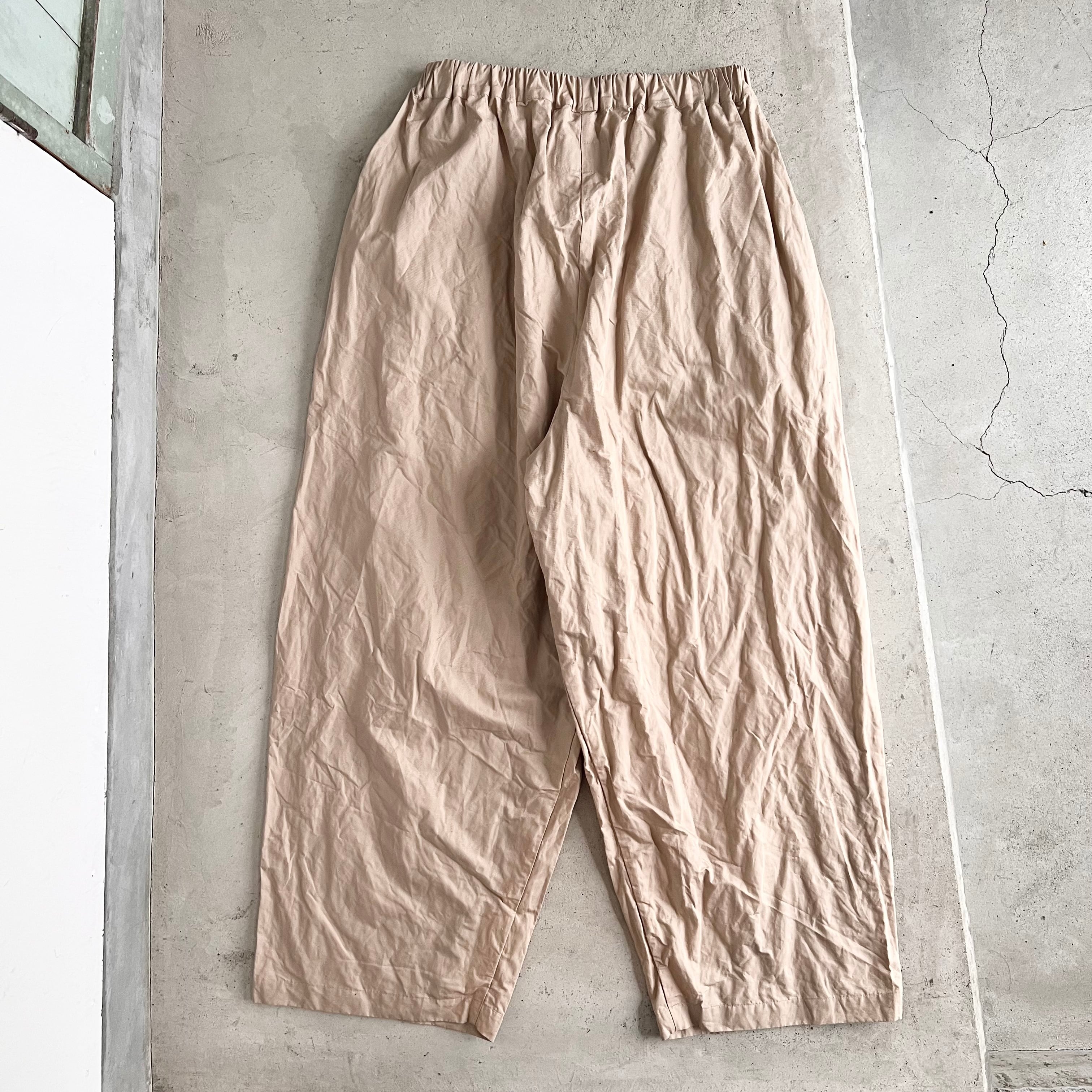 2タックのゆったりとしたサイズ感と、ウエストゴムで楽ちんなはき心地が魅力。