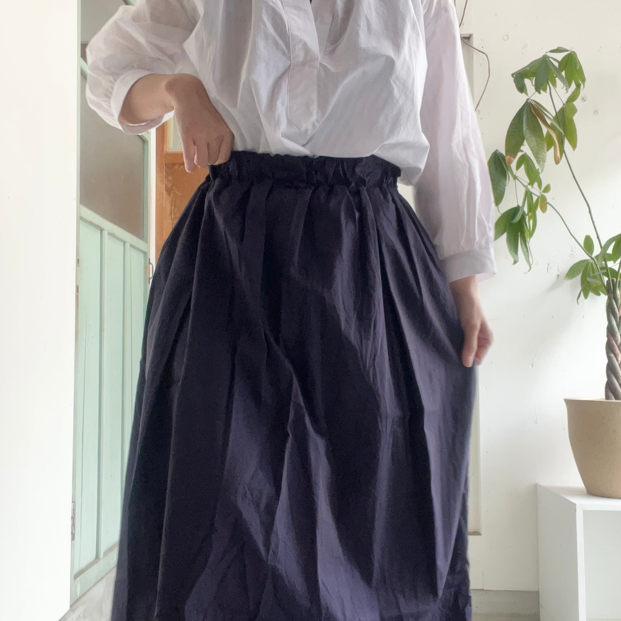 ウエストが総ゴム仕様で、Aラインシルエットのスカートです。
