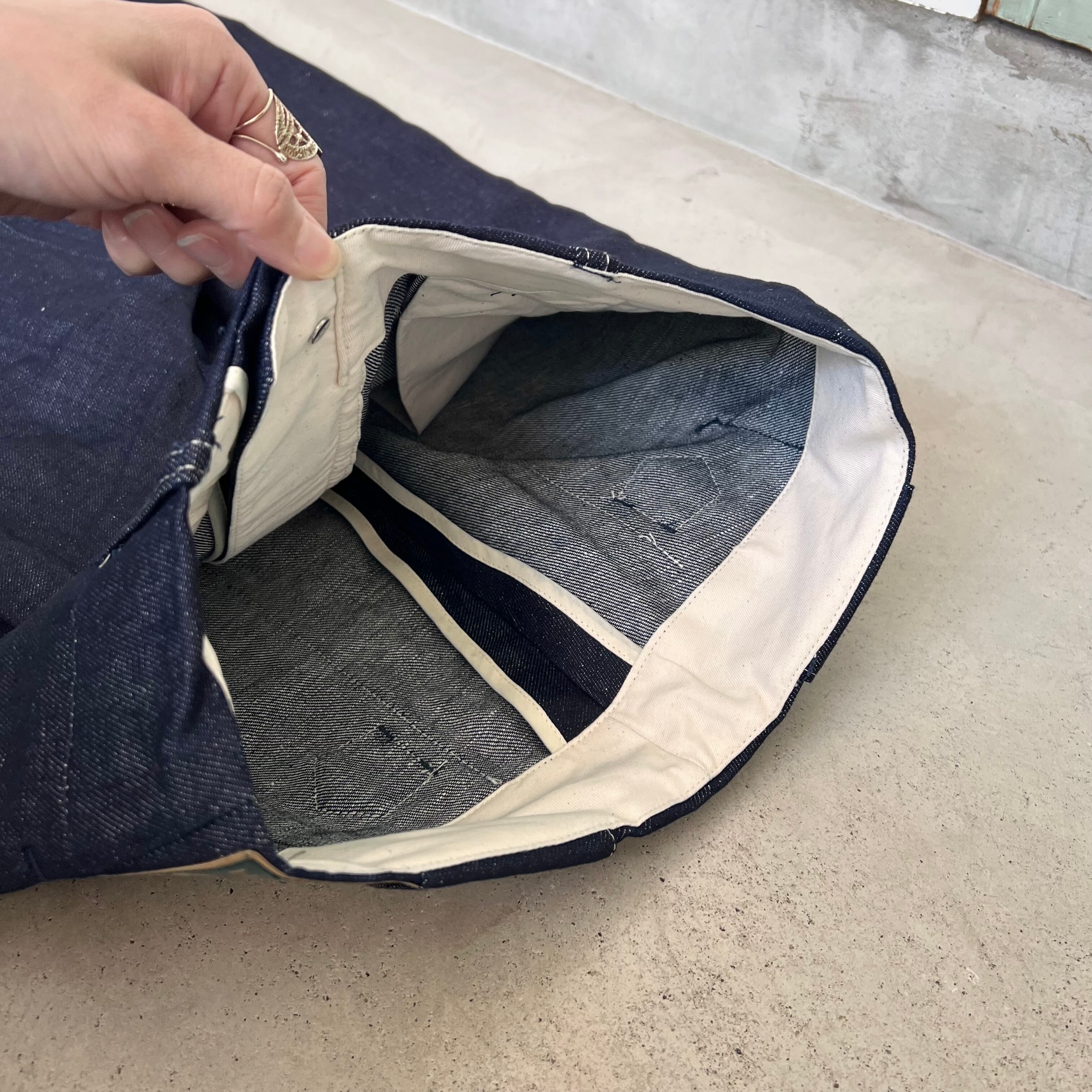 インディゴ染めになりますので、お洗濯の際は色移りなどにお気をつけいただき、経年変化をお楽しみください。
