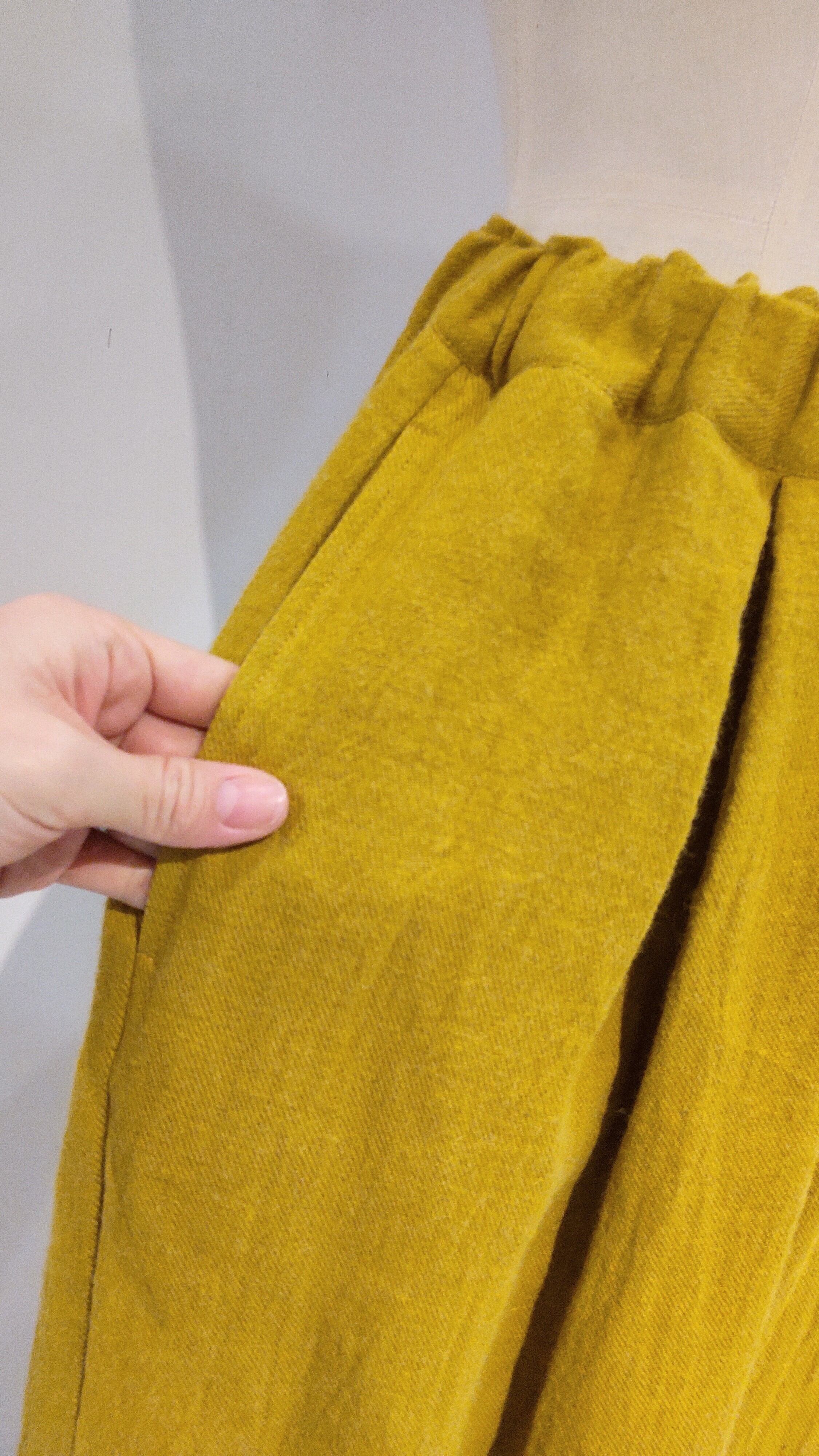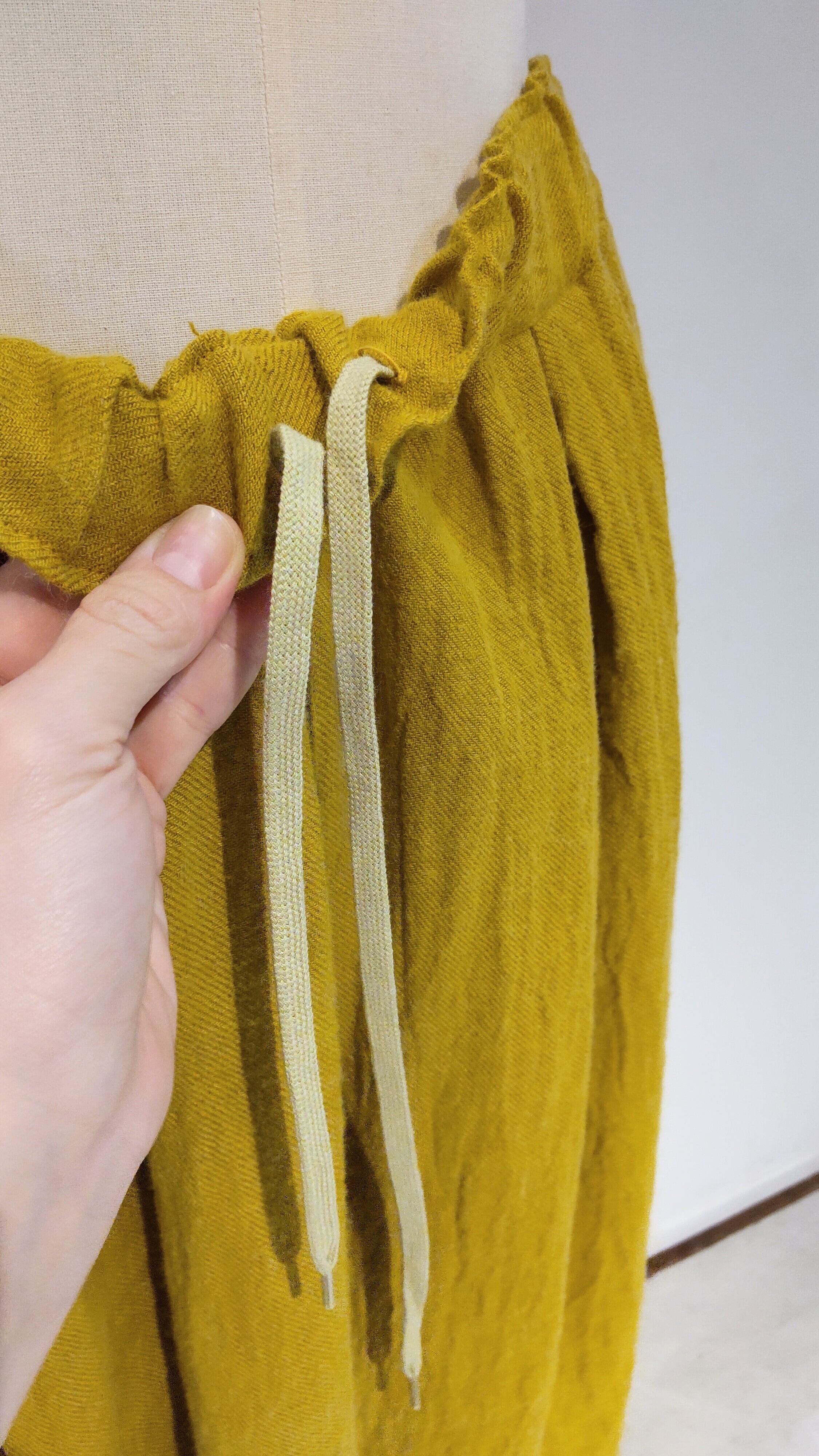 暗くなりがちな冬のコーディネートにぴったりな1枚で、モノトーン等ベーシックカラーとの相性が良いです。ウエストはゴムと紐のデザインです。