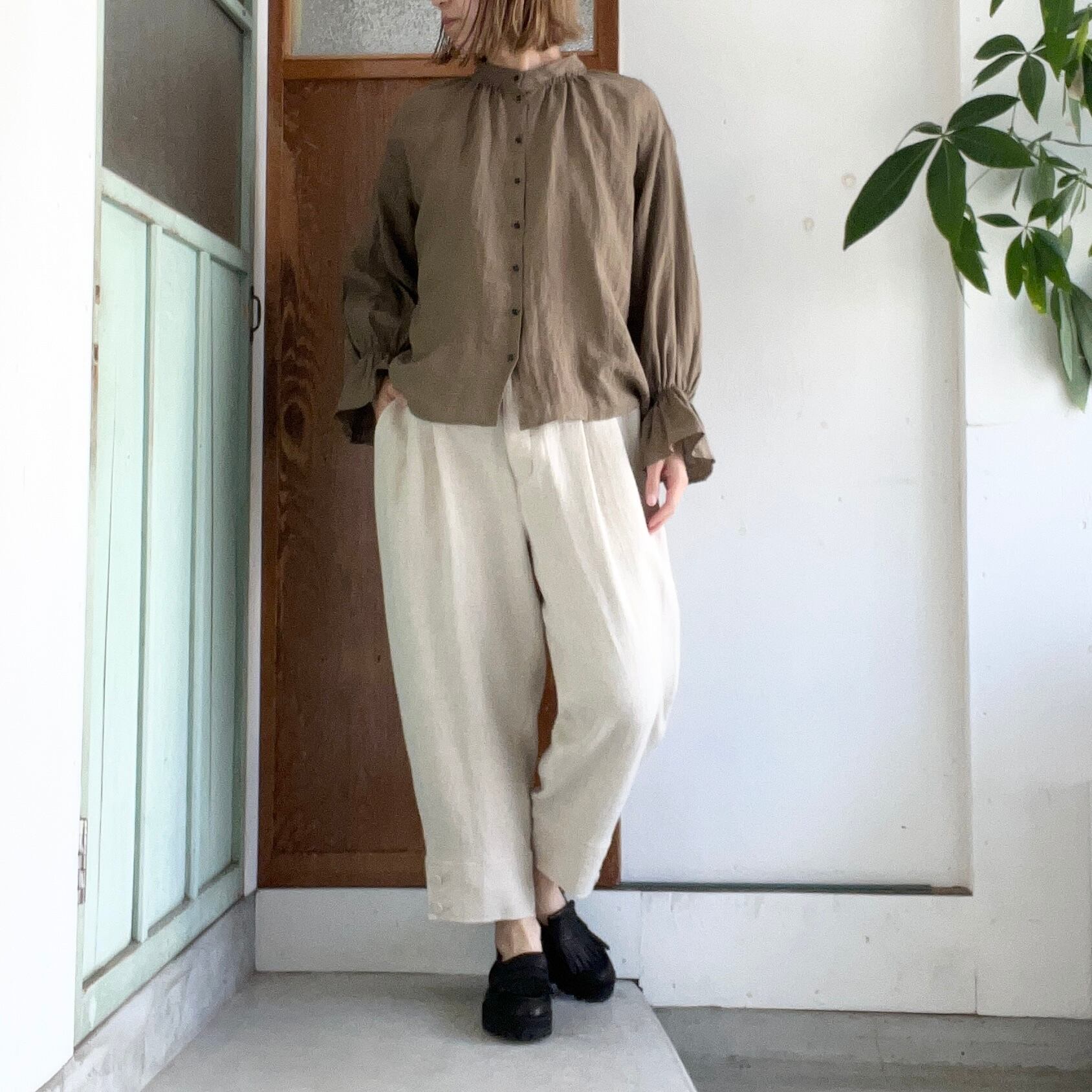 ハリのあるラミー、腰のあるリネン、柔らかいウールから出来た、ざっくりとした膨らみのある素材を使用。