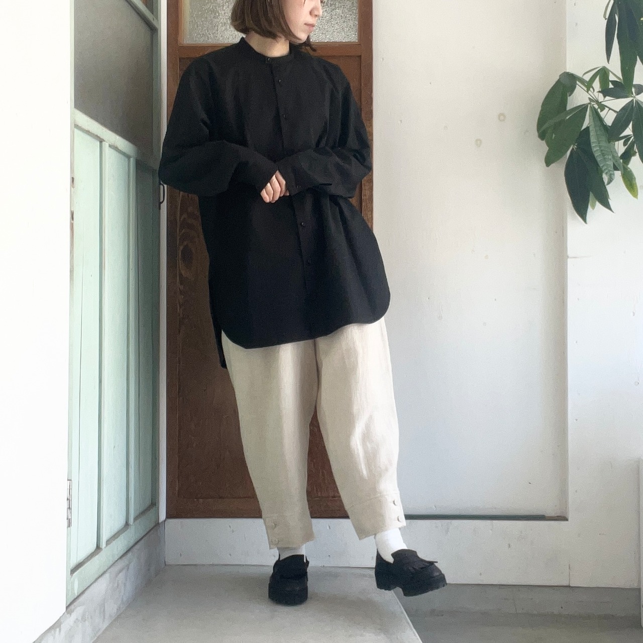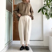 もも周りは丸くゆったりとしたシルエットで、テーパードした裾からのぞく足首がすっきりとバランス良く見せてくれます。