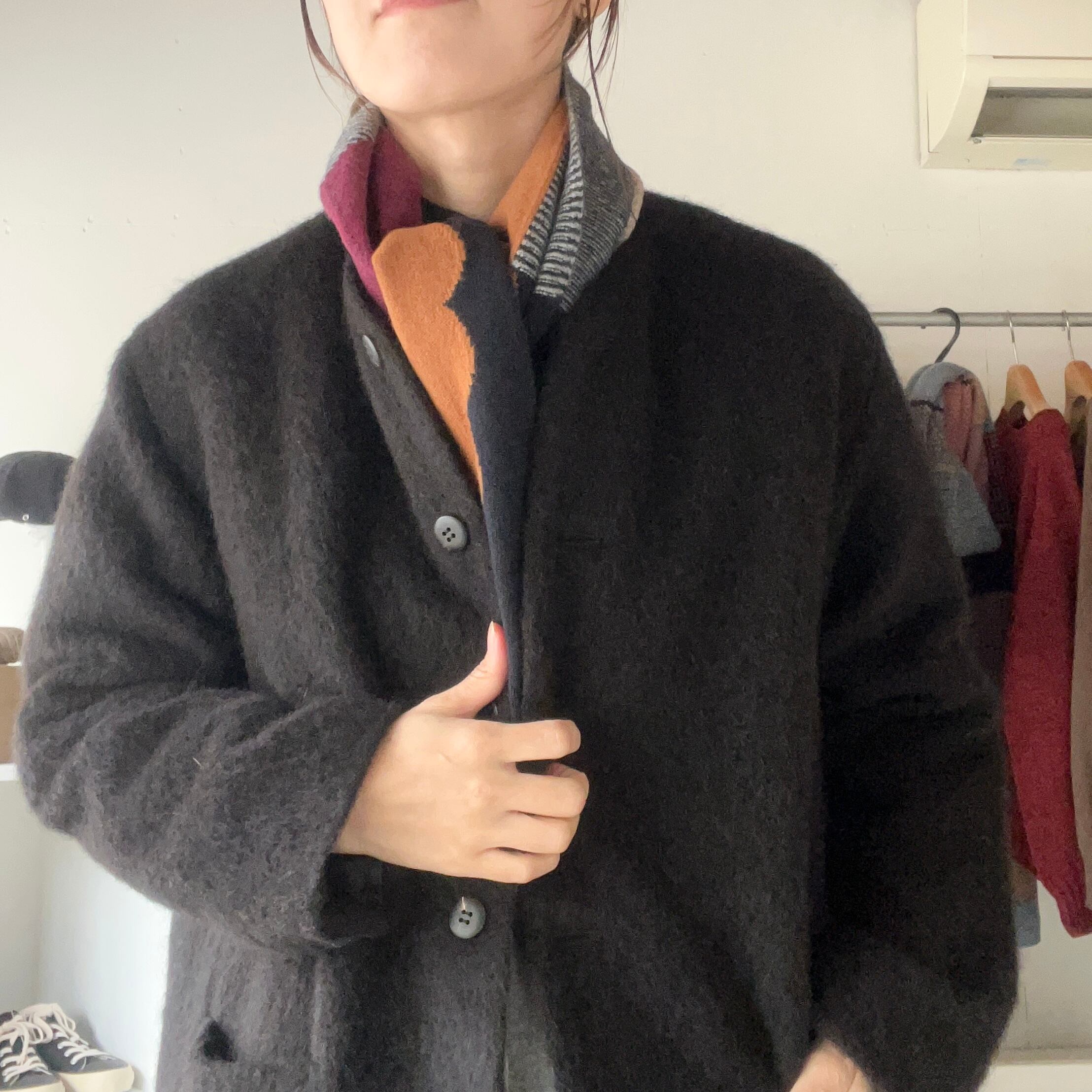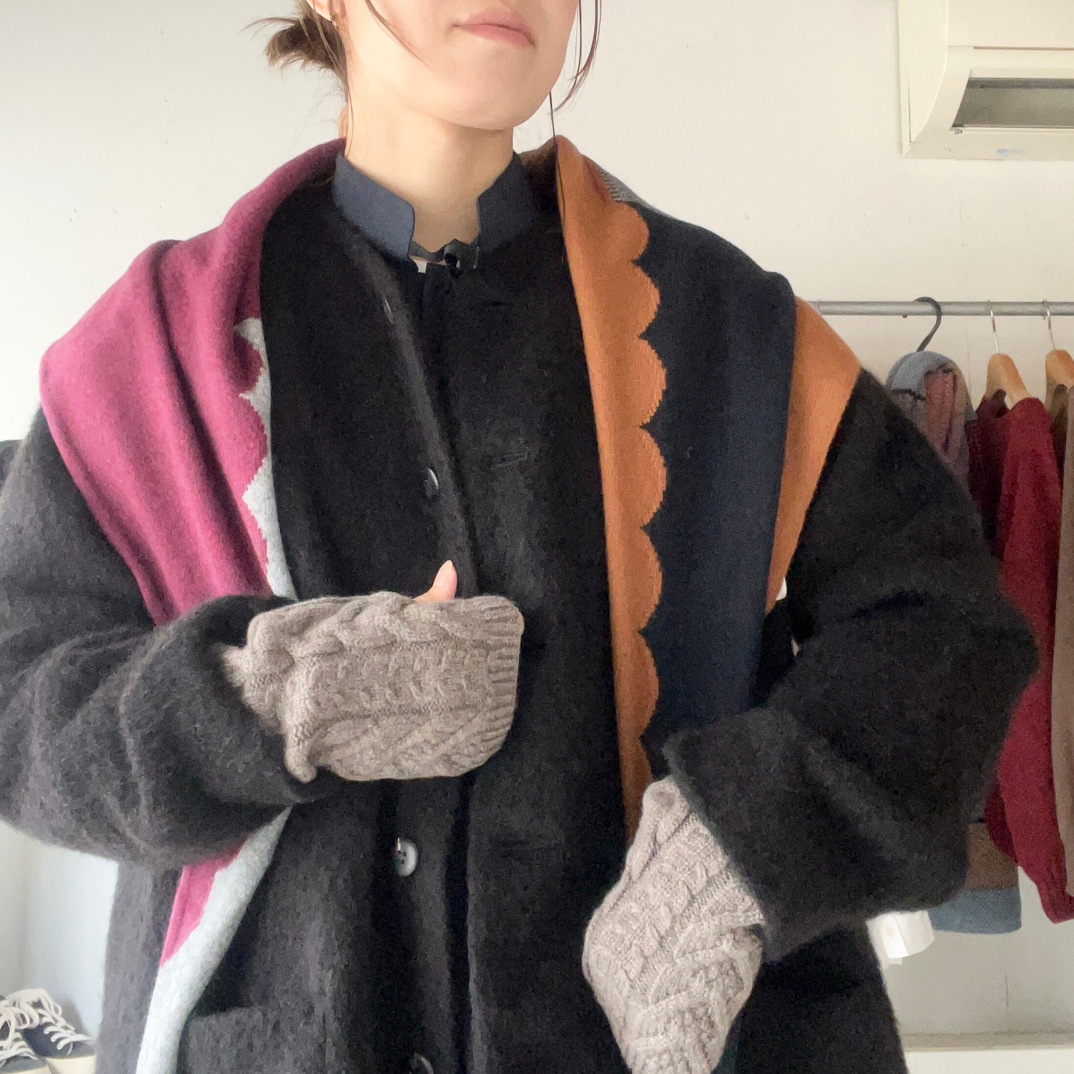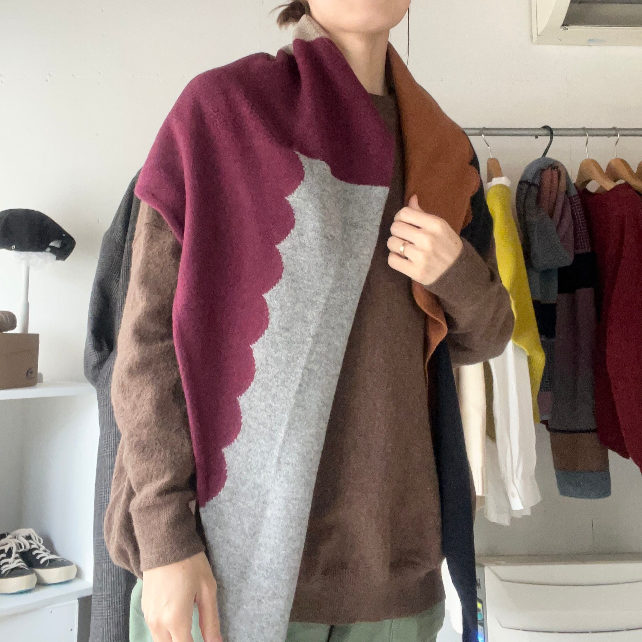 パーツによって編地の違いがあり、巻き方によってカラーや柄の見え方が変わるので、一枚で何通りも楽しめます。